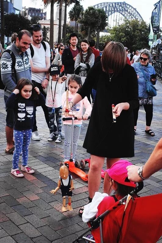 当我第一次来到这个港口的时候,每隔几十米,小提琴、吉他、杂技、吹奏迪吉里杜管(Didgeridoo)的原住民、行为艺术者,变换着出现在身边,艺人们沉静在自己的节目中,游客们走马观花,随手留些硬币。一段法式风情的音乐抓到了我迷离的注意力,眼前是一个短发女生,穿着黑色系的服装,随着音乐,与牵线木偶共舞,她的动作和招式都是极简单的,应该是初学者,但充满童真的画面配合着跳动的旋律,让我不断地产生想要多停留一会儿的冲动。我坐在路边,眼前人来人往,相比于其他的街头艺人,这里显得非常冷清,偶尔可以吸引几个刚学会走路的小孩子,父母们带着孩子与木偶合影一张就匆匆离去。穿梭的人群中,脚下的木偶就成了落寞的独角戏一般的存在。